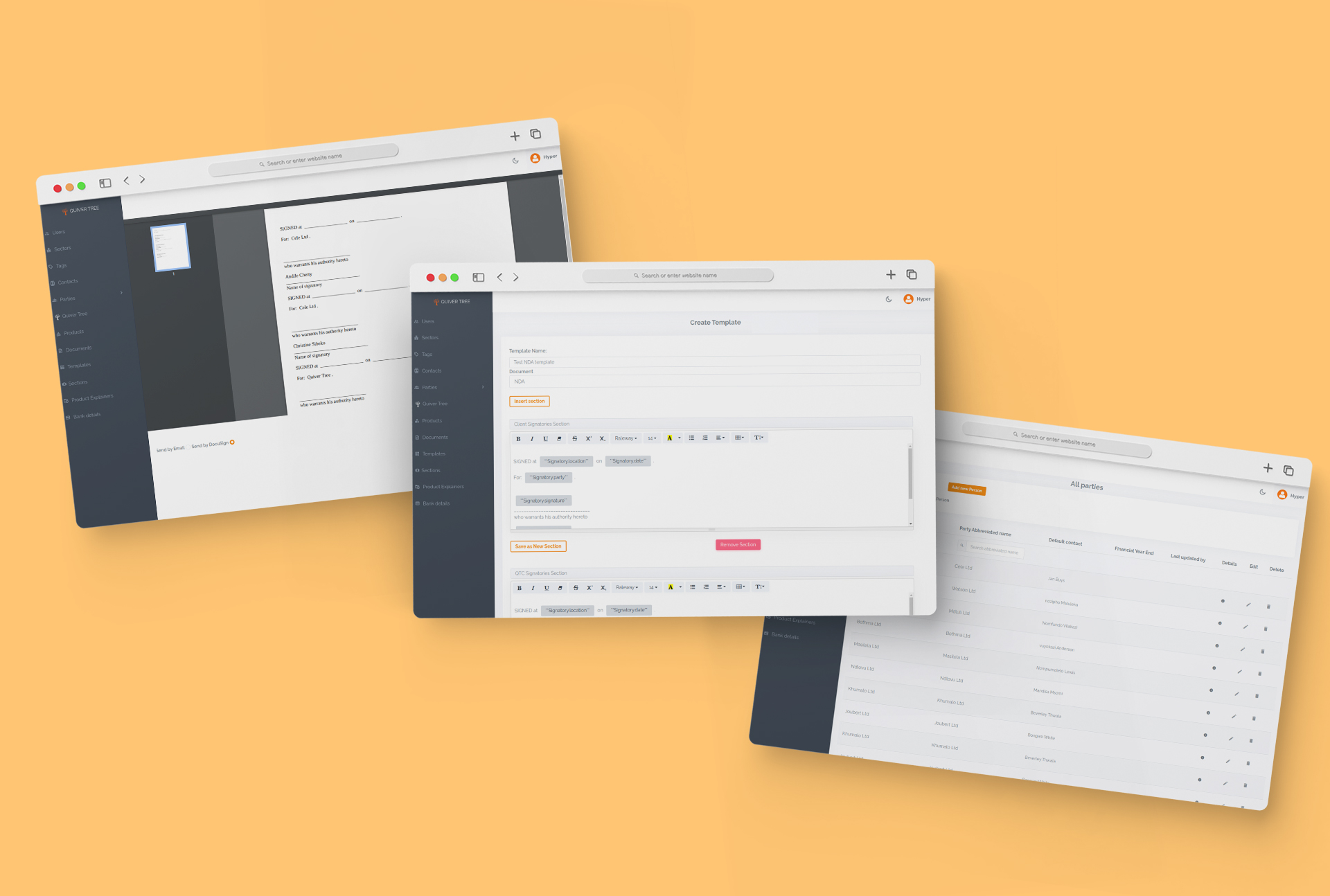 We have built a custom DMS for Quiver Tree Capital, and among many other features, it included document generation, digitally signing documents (with DocuSign service integrated), dynamic document templates, version control, workflow editor with procedures for internal communication, and collaboration on the shared dossiers.